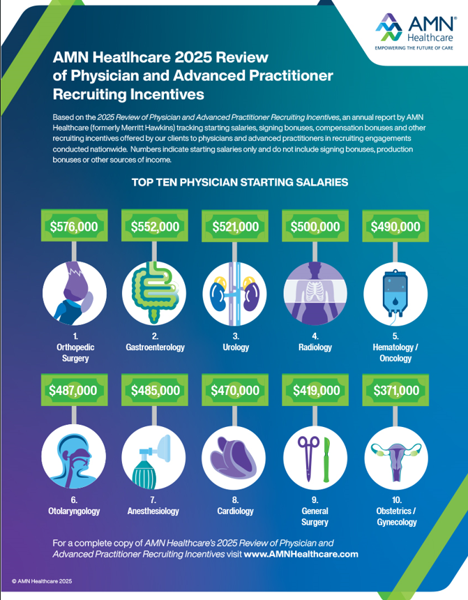 MHA Endorsed Business Partner AMN Healthcare recently released the 2025 Review of Physician and Advanced Practitioner Recruiting Incentives, produced by its Physician Solutions division (formerly Merritt Hawkins).