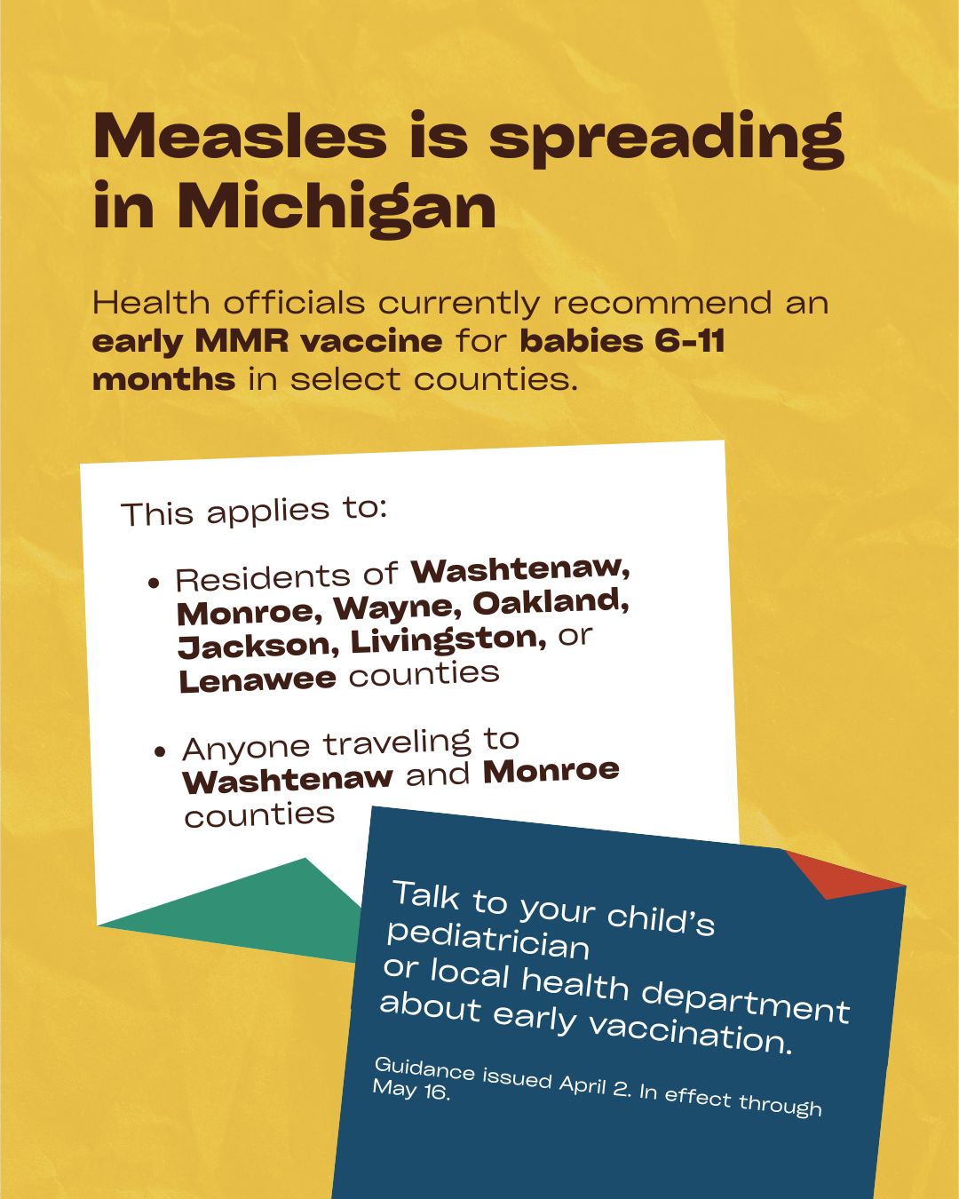 The MDHHS is responding to confirmed measles cases in Washtenaw and Monroe counties and concerns of possible community transmission. Members are encouraged to review MDHHS measles guidance and share the flyer for patients and families. An accelerated measles, mumps and rubella (MMR) dose is recommended for infants ages 6-11 months who live in or travel to Washtenaw, Monroe, Oakland, Jackson, Livingston or Lenawee counties. This recommendation is in effect through May 16.