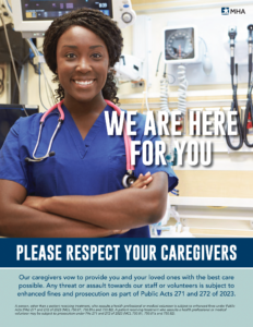The MHA developed workplace safety posters for members to display throughout their facilities communicating the consequences of committing physical harm toward healthcare workers or hospital property. The informational posters are geared toward patients, families and visitors, with a couple of creative options available in two sizes. With the help of MHA Endorsed Business Partner AMN Healthcare Language Services, Spanish and Arabic versions are also available. Complimentary copies of the materials are available to MHA members by request through an online order form. Non-members may purchase materials at cost. Questions about materials may be directed to the MHA.